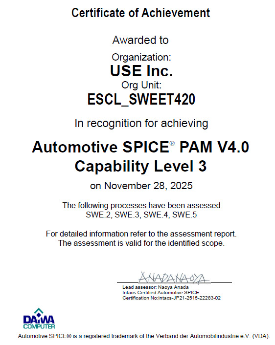 私たちは、2006年からソフトウェア開発プロセス改善活動により、開発審査会の設置や工程管理を行ってまいりました。また、2010年CMMIレベル2達成、2012年CMMIレベル3達成と一貫して開発のプロセス改善活動を進めてきました。 2014年に車載機器開発業務および車載機器検証業務において、車載ソフトウェア開発の標準であるAutomotive SPICEの能力レベル3を達成しました。 今回証明された高い開発能力により、高度化する車載ソフトウェア開発技術に対して、高いソフトウェア品質で応えてまいります。 さらには、確立した車載ソフトウェア開発の標準プロセスを、コンシューマ機器開発やアプリケーション開発に展開していくことで、ソフトウェア開発力をより一層強化してまいります。